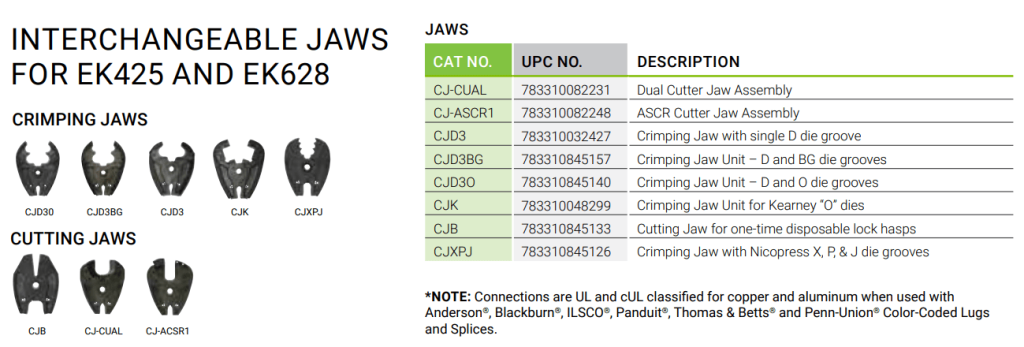 - The EK425LX will complete about 325 crimps per battery charge on 4/0 AWG splices
