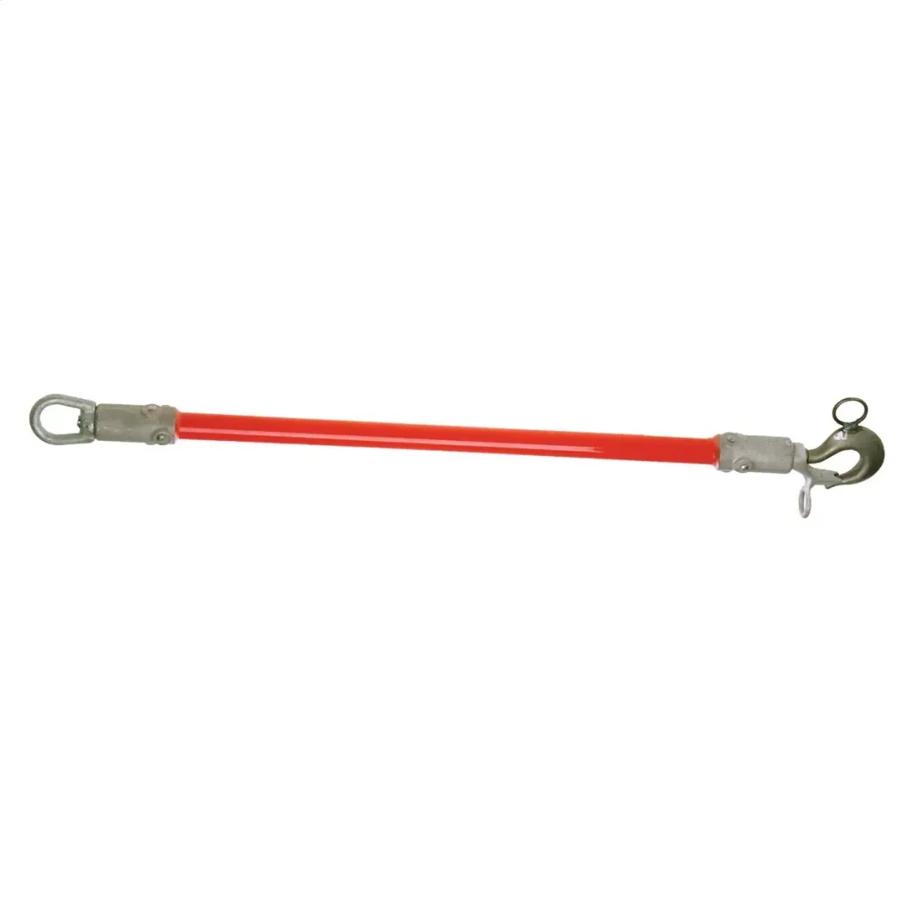 To permit hot-line work with a nylon-strap ratchet hoist, a properly applied link stick insulates the hoist from an energized conductor. The Chance hoist link stick is a 1.25″-diameter Epoxiglas pole with a steel hook on one end and a butt swivel on the other. To apply the link stick, attach the hook of the stick to a wire grip using the hotstick eye to operate the hook. Complete the application by connecting the nylon-strap hoist to the link stick butt swivel and to a pole or crossarm. Rated working load: 4,000 lb.