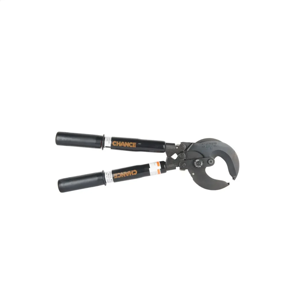 These patented Chance conductor cutters (C4032979) are half the size and weight of standard ratchet cutters. Two styles of the compact cutters ratings match a wide range of overhead and underground conductors. They can get into such confining workspace as manholes and handholes. In practice, they open in less than half the space required for long-handled ratcheting cutters. Their small size also saves on toolbox and warehouse storage. To give long service life, the design of these compact cutters is based on a simple ratchet mechanism. Simple controls and sure ratcheting action makes working with them easy. C-type jaws are heat-treated for lasting strength and sharpness. Stampings on the jaws indicate application limits. Despite their small size, they are built to take punishing field conditions. The reinforced-fiberglass handles are PVCcoated and protected by a vinyl sleeve. Thick vinyl grips shield the handle ends and help worker keep a steady grasp.