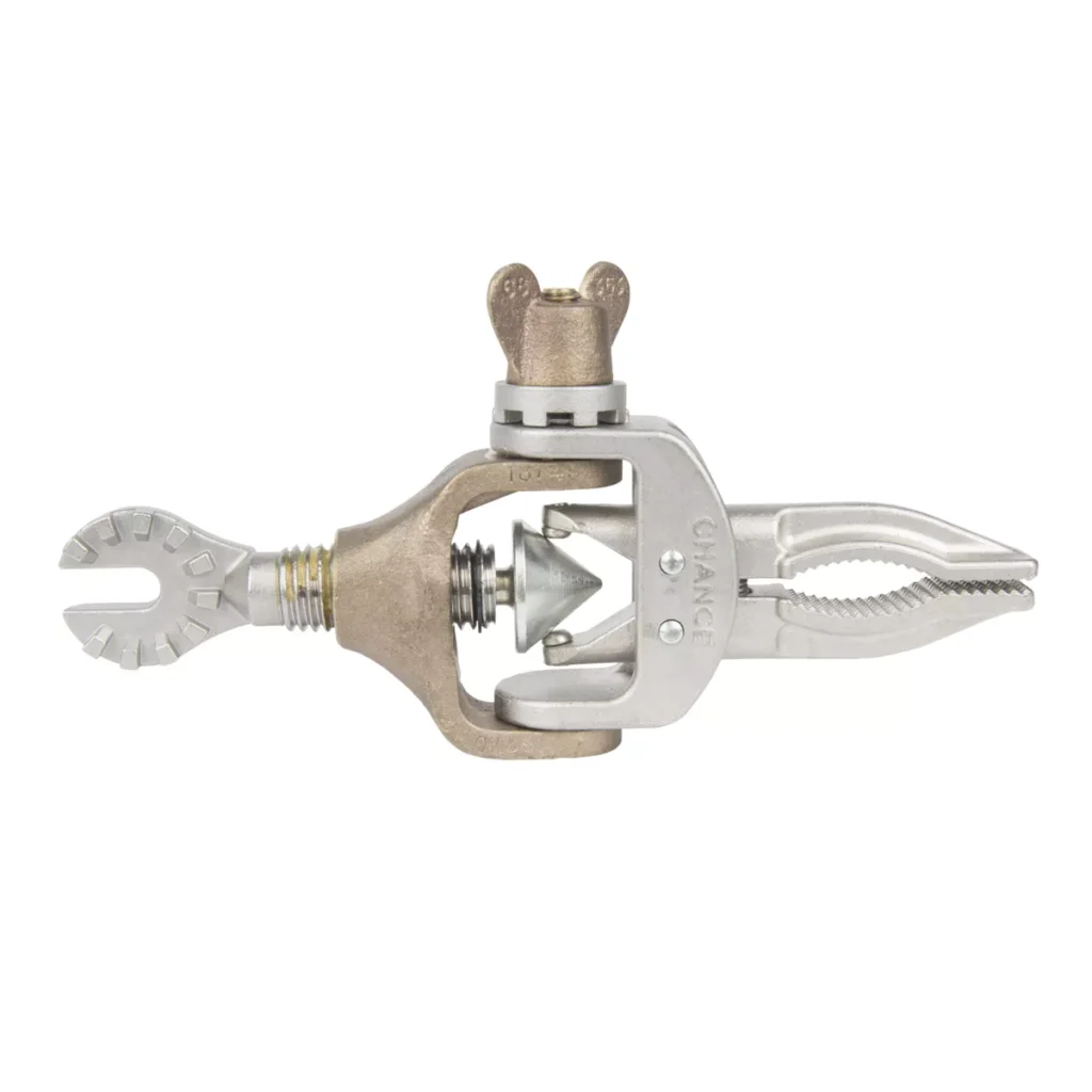 Designed to grasp from any angle, and tighten by clockwise rotation of the Universal Tool handle. The jaws are held firmly in position with a wing-nut. Used as a holding device for retaining bolt heads and loose hardware, adjusting arcing horns, replacingcotter keys, etc.