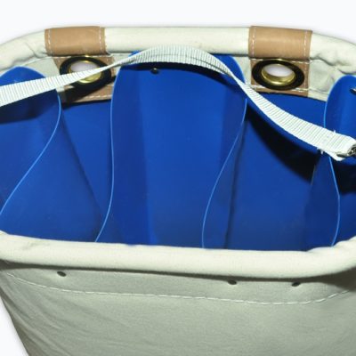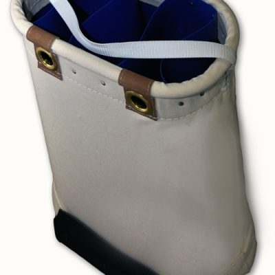 This is an oval bucket made from extra heavy materials to support the weight of compression tools and bolt cutters. The bottom and top ring are extra heavy to support this weight. The sides are reinforced with Hard Body plastic for strength and rigidity. The bag allows the handles to extend above the top ring for easy access. There are 5 compartments for tools. The plastic dividers keep the tools separated for easy access. Two grommets allow attachment to the aerial basket with hooks. A detachable strap stretches across the top of the bag to keep tools in. There is a shock absorbing rubber in the bottom to protect the tools. Also, a rubber “bumper” is attached to the bottom side of the bag to protect the aerial basket from abrasion.