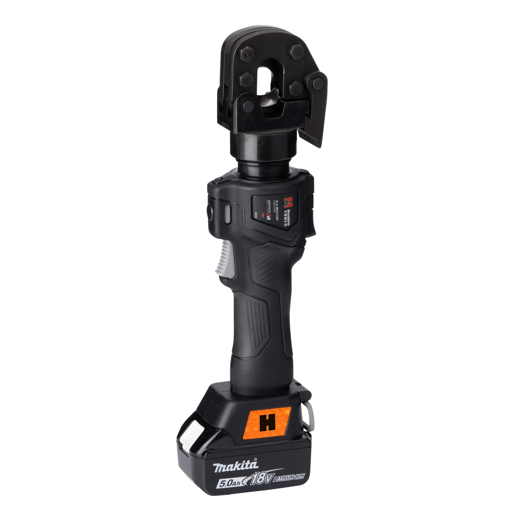 Inline Style Guillotine Latched-Head Hard Metal Cutting Power Tool Kit. Powered by Makita™ Lithium-Ion batteries. Easily cuts through ACSR, ground rod, guy wire, Cu/Al, wire rope, and rebar, produces clean, flat cuts ensuring perfect cable terminations and handles up to 5/8” ground rod, Guy Wire and SC 40 Rebar, 1/2″ SC 60 rebar and 7/16″ Cu/Al. 5-year tool, 3-year battery Huskie Tools® limited warranty. 75kV live line rated.