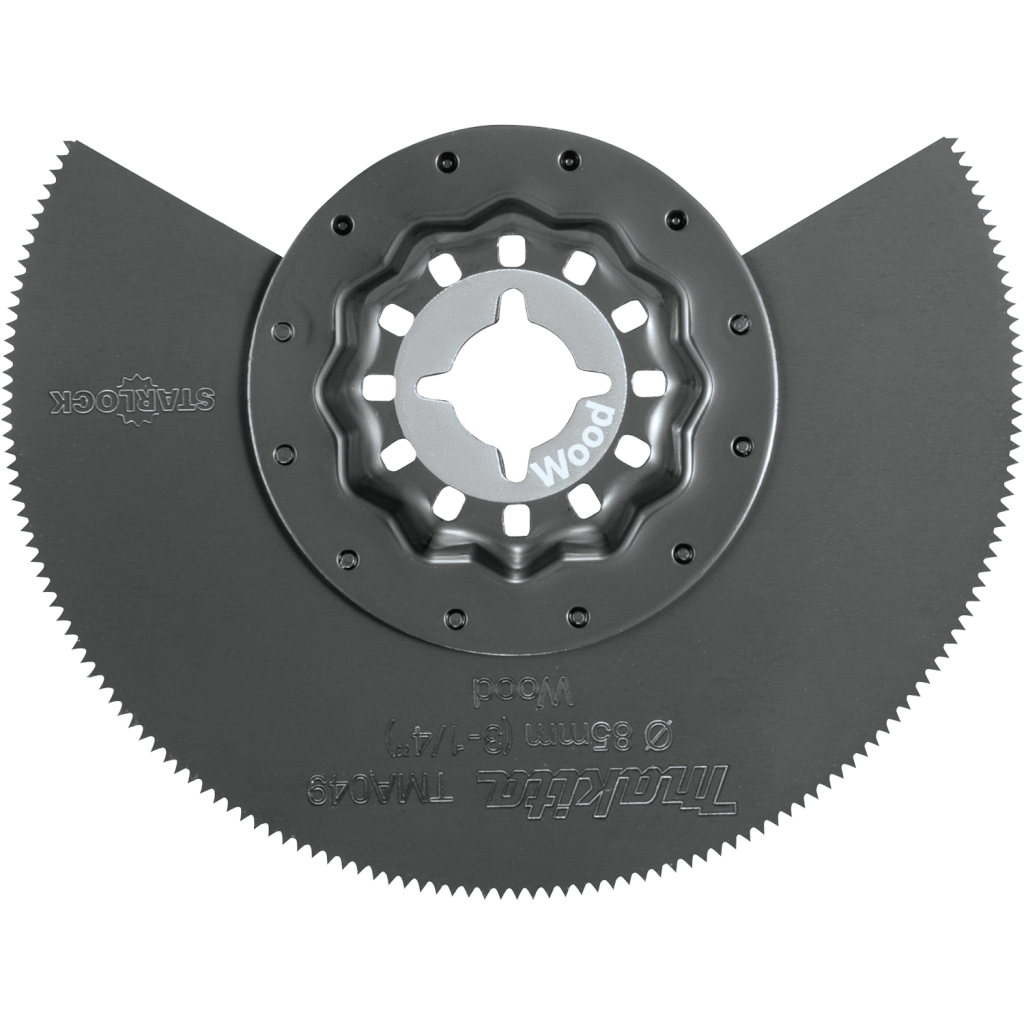 The Makita® 3-1/4” Starlock® Segmented Blade is engineered for plunge and accurate cutting. The blade is ideal for plunging into soft wood, laminated floors, and drywall. The blade features an ultra-thin .55” kerf. The high carbon steel edge works for general-purpose wood cutting applications. The Starlock® Interface provides maximum performance and is compatible with most oscillating multi-tools (sold separately).