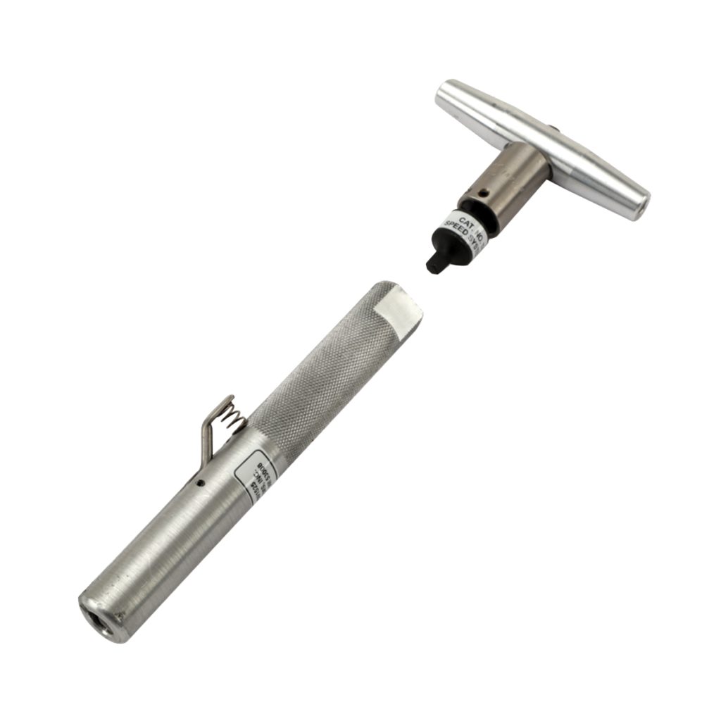 The LPW-1525/TK120X-N combines the torque limiting features of the TK120 Tor-Key and LPW1525 Loadbreak Probe Wrench with an added V-Groove and cross hole in the handle providing neutral winding capability used in removal of the outer jacket. The Tor-Key has a preset torque of 120 in. lbs. and rotated until the Tor-Key “clicks”, indicating that the preset torque value has been reached. The LPW1525 Loadbreak Probe Wrench is designed to provide a means of preventing probe arc follower contamination and other damage. It holds the loadbreak probe for positioning into the threaded eye of the elbow crimp connector.